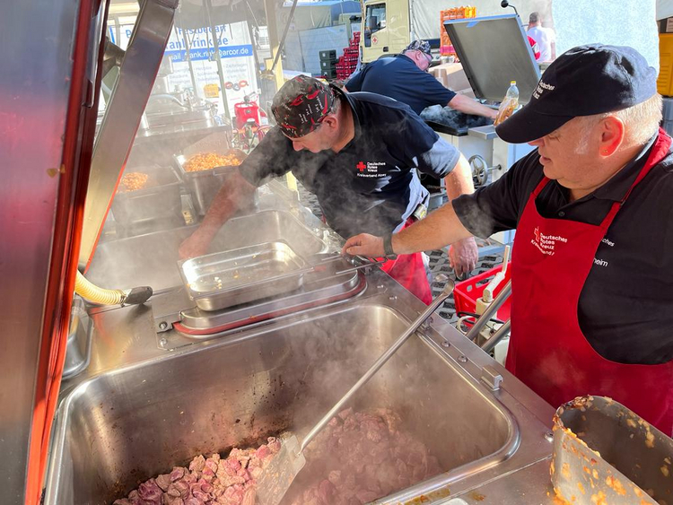 Die Helfer*innen vom Verpflegungsdienst des Deutschen Roten Kreuzes sind stets besonders gefragte Einsatzkräfte. Das oft zitierte Motto „ohne Mampf - keinen Kampf“ ist dabei mehr als nur eine Floskel, denn eine gesicherte Verpflegung ist eine wesentliche Voraussetzung für die dauerhafte Einsatzfähigkeit aller Einsatzkräfte. Organisationsintern werden die Helfer*innen des Verpflegungsdienstes zu Feldköchen/Feldköchinnen ausgebildet. Während ihrer Ausbildung lernen sie, Feldkochherde zu betreiben und Mahlzeiten in großen Mengen zuzubereiten. Dabei werden sowohl die hygienischen als auch die logistischen und organisatorischen Anforderungen berücksichtigt.