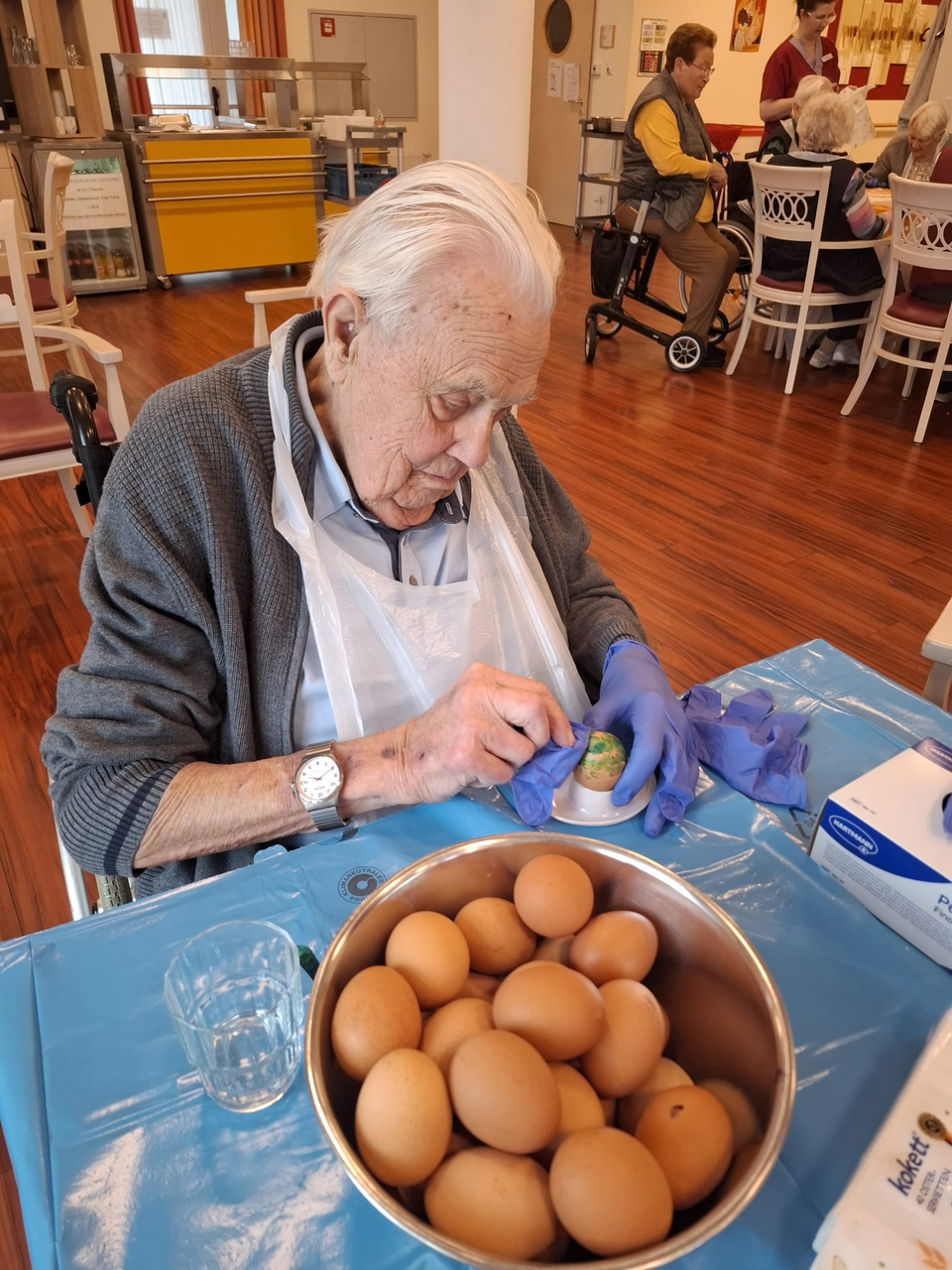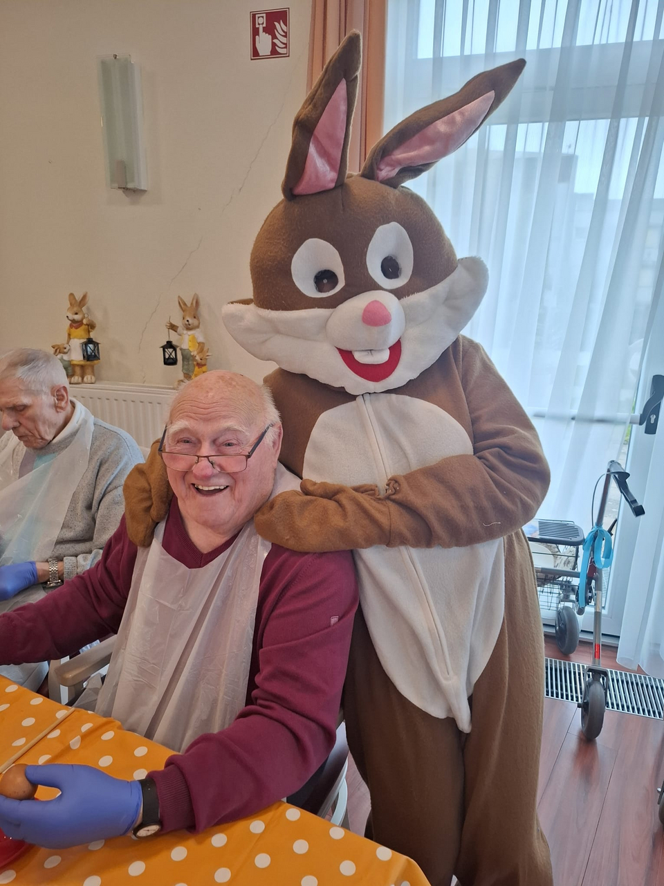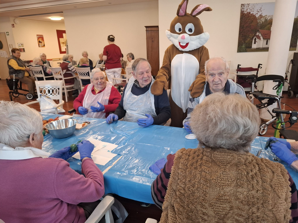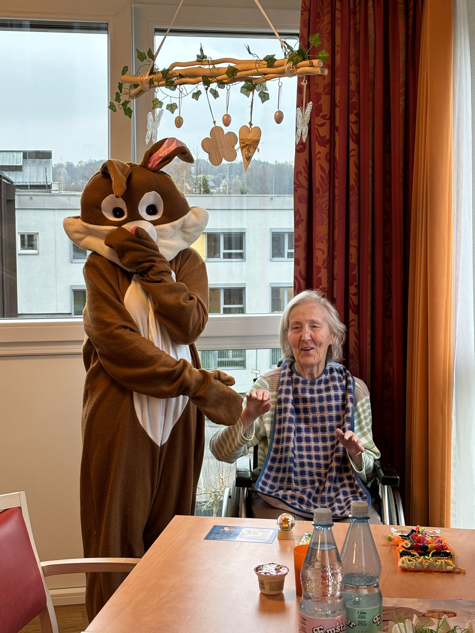 Bereits am Vormittag war die Vorfreude deutlich spürbar. Viele Bewohnerinnen und Bewohner versammelten sich in den Gemeinschaftsräumen, erzählten von früheren Osterfesten und erinnerten sich an alte Traditionen. Als der Osterhase schließlich erschien, war die Begeisterung groß. Mit seinem freundlichen Auftreten und einem gut gefüllten Körbchen zauberte er allen ein Lächeln ins Gesicht.