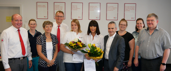 Von links nach rechts: Rainer Hoffmann (Landesbereitschaftsleiter), Ulrike Eisen (JRK-Bildungsreferentin), Anke Marzi (Vorstandsvorsitzende), Rainer Kaul (Präsident), Michelle Berkemann (neue Vertrauensperson), Trudel Becker (ehemalige Vertrauensperson), Manuel Gonzalez (Vorstand), Sophie Petri (JRK-Landesleiterin), Sandra Raabe-Robe (Landesbereitschaftsleiterin), Michael Höhrhammer (Landesbereitschaftsarzt)