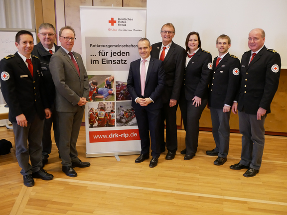 DRK-Vorstand Manuel Gonzalez referierte über das Hauptaufgabenfeld Gesundheitlicher Bevölkerungsschutz. Wichtig sei, den Rettungsdienst nicht isoliert zu betrachten, sondern immer in enger Verzahnung mit dem Katastrophenschutz und damit mit dem Ehrenamt. „Der Rettungsdienst ist,“ so Gonzalez,“ eine Speerspitze des Katastrophenschutzes.“ Und sie muss immer basisorientiert bleiben. „Unsere Pluralität, unsere Tradition und unsere Werte sind es, die uns als Rotes Kreuz stärken.“ Und so braucht es eine enge Vernetzung von ehren- und hauptamtlichen Strukturen, ein sich gegenseitig Stützen. Gonzalez verwies auf aktuelle politische Veränderungen, die sich im Zuge des Gutachtens des Sachverständigenrates ergeben. Nicht zuletzt erläuterte er, welche Perspektiven sich für das Rote Kreuz bzgl. Leistungsfähigkeit, personeller Ausstattung und Ausbildung zeigen werden. Gonzalez machte deutlich, dass das Rote Kreuz sich mit der demografischen Entwicklung, demzufolge einer erhöhten Nachfrage an den Leistungen, aber auch dem Individualismus und manchen Informationsdefiziten der Bevölkerung (z.B. bzgl. der Telefonnummern 116/117) intensiv beschäftigen muss. Seiner Meinung braucht es bei allen Veränderungen eine  Kultur des Miteinanders, ob Ehren- mit Hauptamt, oder Leistungserbringer wie das DRK  mit Kostenträgern, Rettungsdienstbehörden und Krankenhäusern. Unter dem Motto „Kenntnis schafft Verständnis“ warb er für ein „Aufeinander-Zugehen.“ Er rief die Teilnehmenden der Landeskonferenz der Bereitschaften auf, sich an dem aufwachsenden komplexen Hilfeleistungssystem zu beteiligen und den Prozess innerhalb des Hauptaufgabenfeldes Gesundheitlicher Bevölkerungsschutz mitzugestalten. Landesbereitschaftsleiter Rainer Hoffmann liegt es am Herzen, sich als Landesbereitschaftsleitung in die Diskussion rund um das Hauptaufgabenfeld Gesundheitlicher Bevölkerungsschutz  einzubringen. Er stellte deshalb das 10-Punkte-Programm vor. Dazu gehören u.a. die stärkere Öffnung des Rettungsdienstes für das Ehrenamt, das Stärken und Weiter-Ausbauen des First-Responder-Systems, die Rufbereitschaft/Hintergrunddienste der Ehrenamtlichen, die Umsetzung des HiK-Konzeptes 3.0. und die Sicherstellung der Sanitäts-Wachdiensten. Auch Präsident Rainer Kaul ist das freundschaftliche Miteinander von Ehren- und Hauptamt wie auch zu anderen Organisationen wichtig. Er warb ausdrücklich dafür, dass sich Hauptberufliche im Ehrenamt engagieren. Dies sei im Rahmen des Gesundheitlichen Bevölkerungsschutzes eine große Chance. Doch er sprach sich auch für eine Vernetzung mit der Wohlfahrt- und Sozialarbeit aus. Anschließend referierte Andreas Hitzges über Neuigkeiten aus dem Innenministerium. Dabei standen vor allem Neuerungen der anstehenden Rettungsdienst-Novelle im Fokus. Vergaberecht, Berufsbild Notfallsanitäter, organisierte Erste Hilfe wie First Responder sind nur einige der Schwerpunkte. Ausdrücklich lobte er die AG der Hilfsorganisationen im Katastrophenschutz. „Die HiK ist eine super Sache,“ so Hitzges. Dabei schätze er vor allem die konstruktive Zusammenarbeit.