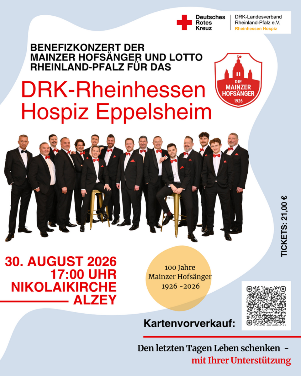 Freuen Sie sich auf ein eindrucksvolles Konzerterlebnis, das musikalischen Genuss mit einem guten Zweck verbindet. Mit jedem verkauften Ticket wird diese wertvolle Arbeit unterstützt: Das DRK-Rheinhessen Hospiz Eppelsheim ist ein Ort, an dem das Leben zählt – bis zum letzten Augenblick. Hier finden schwerkranke Menschen und ihre Angehörigen Zuwendung, Geborgenheit und Begleitung.