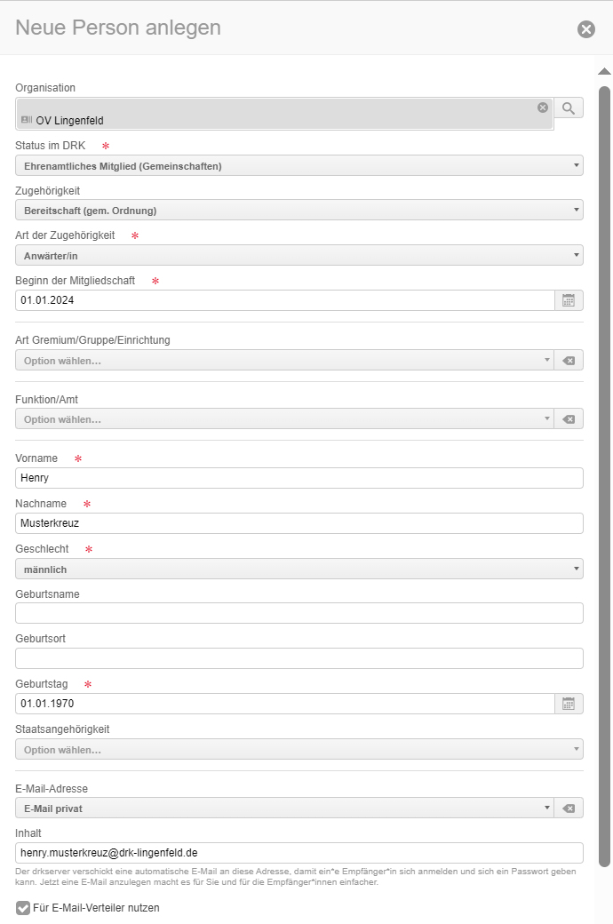 Henry Musterkreuz hat sich entschieden dem DRK und den Bereitschaften als Bereitschaftsmitglied beizutreten. Er füllt daher die Beitrittserklärung zu den Bereitschaften im LV RLP und, je nach örtlicher Regelung, noch eine Beitrittserklärung zum örtlichen DRK-Verband aus. Da die örtliche Bereitschaftsleiterin ihn immer wieder zu den Dienstabenden einladen will bzw. ihn ggf. kontaktieren muss, wird für Henry eine Personalakte im drkserver angelegt.