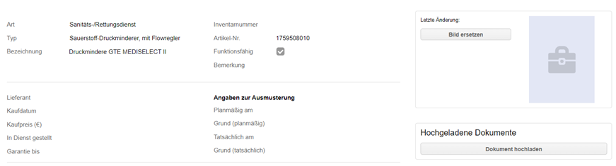 Der drkserver bietet die Möglichkeit zu jedem Artikel ein Bild und mehrere Dokumente hochzuladen. Dadurch besteht die Möglichkeit die notwendige Bedienungs-/Reparaturanleitung langfristig und nachhaltig abzulegen (Das Copyright der Bilder beachten).